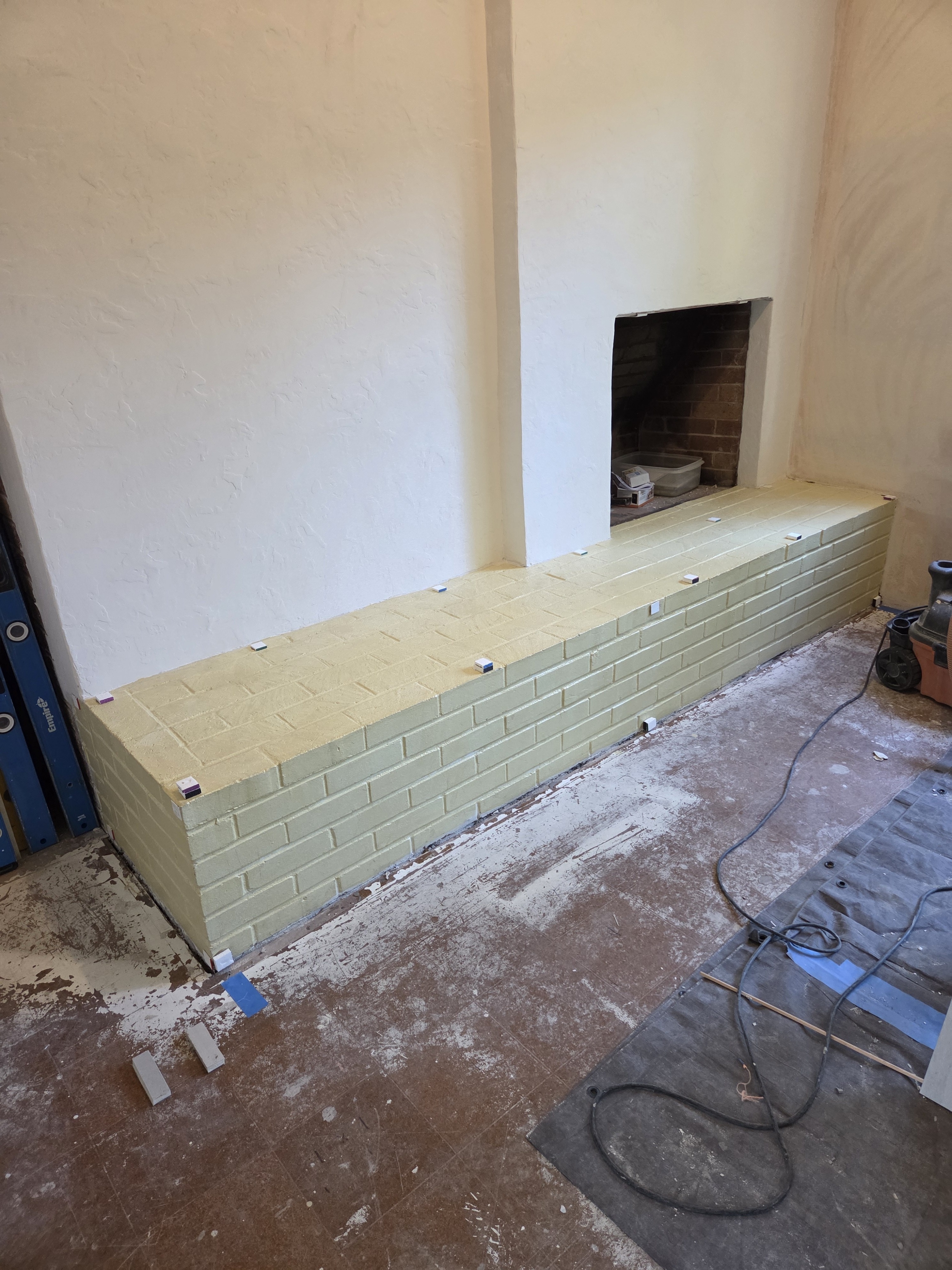 How to prepare a brick fireplace hearth, for large format tile (or any tile, for that matter), when the brick has been painted, and is substantially out of square, plumb, and level: 1. Clean hearth. 2. Apply the appropriate primer over painted surface. 3. Build up plumb screed rails on all vertical faces, that are square with each other, then let dry overnight. 4. Float all vertical faces with non slumping polymer modified thin set, then let dry overnight. 5. Apply second float if necessary. 6. Install dam, and mask for self leveling compound, for top of hearth, then allow caulking to dry overnight. 7. Pour self leveling compound. Next step, set the tile.